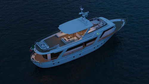 Dominator Ilumen is proud to offer owners an upscale high-tech construction in post-cured glass and carbon fiber mixed with epoxy resin to the full use of epoxy filler cycle and the application of the Awlcraft painting cycle that is incomparable to the common gel-coats and polyester fiberglass usually used on yachts this size. This maximises strength, mobility and weight-saving. Above all, every Ilumen has a double bottom with structural fuel tanks, which ensures a low barycentre and enhanced stability, safety and performance. With this new construction method of fiberglass, Dominator Ilumen does not only offer 10 years of warranty to the structure but also an infinite choice of completely bespoke colour choices within this painting system that is known to be used on mega yachts only.